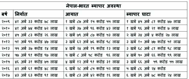 हिमालका स्याउहरू कुहिएर फाल्नुपर्ने अवस्था छ | पहाडका सुन्तलाहरूको हालत त्येही छ | तराईमा उत्पादन गरिएको तरकारीका लागि बजारको उचित व्यवस्थापन नहुँदा कृषकहरूले कुहाएर कम्पोष्ट मल बनाउनुपर्ने अवस्था कुनै बेला थियो | स्वदेशमा उत्पादन हुने बस्तुहरूको आन्तरिक खपत र निर्याततर्फ त हामीले सोचेनौं नै, सँगसँगै बिदेशी उत्पादन र बस्तुहरुको नेपाली बजारमा रहेको साम्राज्य अन्त्य गर्ने कुरातर्फ पनि हाम्रो ध्यान पुगेन | सबै उद्द्योगहरू बन्द गरिए | राज्यको ‘सब-सिडी’ नहुँदा नेपाली किसानहरूले उत्पादन गरेका बस्तुहरुले भारतबाट आयातित बस्तुसँग प्रतिस्पर्धा गर्न सकेनन् | फलस्वरूप नेपाली बजार बिदेशी बस्तुहरूले कब्जा गरे | यो अवस्थाका कारण उत्पादक तथा उद्योगीहरूमा नैराश्यता पैदा भयो र उत्पादनको हकमा नेपाल कमजोर हुँदै गयो | जसले गर्दा हामी आयात मात्रै गर्न बाध्य भयौं र निर्यातको अवस्था दर्दनाक हुँदा नेपालको भारतसँगको ब्यापार घाटा पूरै एक पक्षीय बन्न पुग्यो |यहाँ सन् २००९ देखि सन् २०१७ सम्मको नेपालको भारतसँगको ब्यापारको तथ्याङ्क प्रस्तुत गरिएको छ: