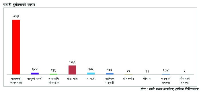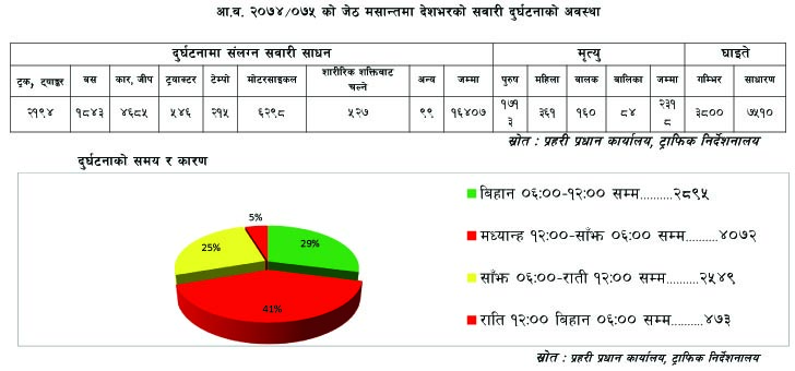 माथिका दुर्घटनाका विवरणहरूलाई विश्लेषण गर्ने हो भने यो आर्थिक वर्षको जेठ मसान्तसम्म मात्रै हामीले २ हजार ३ सय १८ जनालाई सवारी दुर्घटनामा गुमायौं । करिब ४ हजार गम्भीर घाइते भएका छन् । आठ हजार जना साधारण घाइते भएका छन् । त्यस्तै १६ हजार ४ सयभन्दा बढी सवारी साधन दुर्घटनामा परेका छन् । यसरी भएका सवारी दुर्घटनामा ज्यान गुमाउने ब्यक्तिको परिवारमा पर्न गएको आर्थिक, सामाजिक तथा मानसिक क्षतिलाई कुनै शब्द र अङ्कमा गणना गर्न सकिँदैन । यद्यपि यसबाट भएको भौतिक क्षतिलाई हेर्ने हो भने अर्बो रुपैयाँको क्षति भएको छ ।