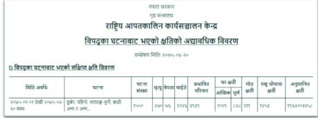 नेपाल सरकार, गृह मन्त्रालयले जारी गरेको तथ्याङ्क अनुसार २०७५ साल बैशाखदेखि अहिलेसम्म प्राकृतिक प्रकोपमा परी देशभरमा ४७० जनाको ज्यान गएको छ । ७६ जना वेपत्ता भएका छन् भने २२४६ जना भाइते भएका छन् । प्राकृतिक विपद्बाट झण्डै २ अर्बको क्षति भएको छ । तर यसपल्टको अविरल वर्षा कायमै रहेकाले अझै ठूलो जनधनको क्षति हुने अनुमान गर्न सकिन्छ ।