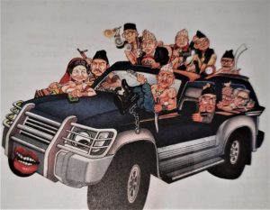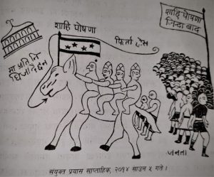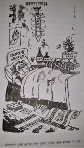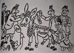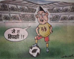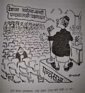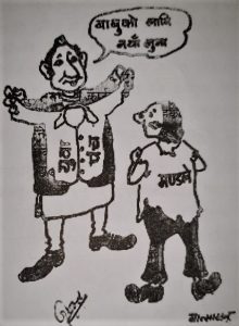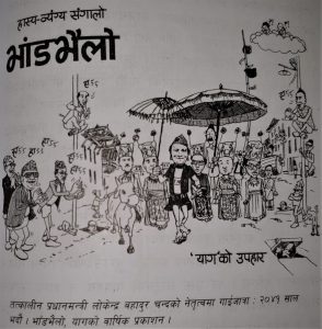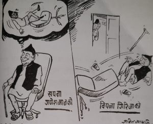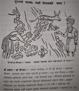 यसैगरी वि.सं. २००७ पछि संविधान सभाको चुनाव कि संसद्को चुनाव भनी सात वर्षदेखि रुमल्लिरहेको त्यसबेलाको नेपाली राजनीतिमा बक्र रेखा कोर्दै राजा महेन्द्रले संसद्को चुनावको घोषणा गरेपछि डा. के. आई. सिंहको पार्टी संयुक्त प्रजा पार्टी निकटको पत्रिका संयुक्त जनप्रयासमा २०१४ साउन ५ मा प्रकाशित कार्टूनलाई पहिलो नेपाली कार्टूनका रूपमा पुस्तकले खुट्याउँदै सो कार्टून समेटेको छ । (हेर्नुस् कार्टून)