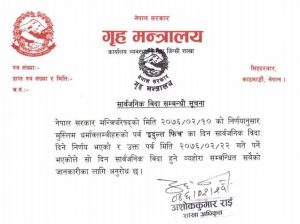 तर, मुस्लिम आयोगको सिफारिसमा भोलि नै बिदा दिने भएको गृह मन्त्रालयद्वारा आज जारी विज्ञप्तिमा उल्लेख छ ।