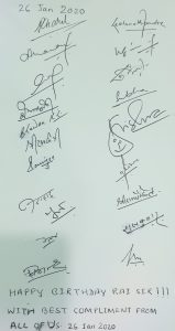 तस्बिरका पछाडिपट्टि सबैले हस्ताक्षर गरे । अनि गरियो राई सरलाई हस्तान्तरण । राई सरका बारेमा बिहानै सहयात्री पहिलोपोष्ट डट कमले विशेष सामग्री प्रकाशन गरिसकेको थियो ।