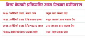 विश्व बैंकले जारी प्रतिव्यक्ति आय सम्बन्धी नयाँ रिपोर्ट अनुसार नेपालको प्रतिव्यक्ति आय सन् २०१९ मा १०९० अमेरिकी डलर पुगेको छ । नेपालीको प्रतिव्यक्ति आय सन् २०१८ मा ९६० अमेरिकी डलर थियो । विश्व बैंकले प्रतिव्यक्ति आयको आधारमा गर्ने वर्गीकरण तालिकमा नेपाल न्यून आय भएको देशबाट न्यून मध्यम आय भएको देशको समूहमा स्तर्राेन्नती भएको छ । कोरोना महामारीका कारण नेपालको अर्थतन्त्रमा पनि मन्दी छाएको अवस्थामा विश्व बैंकले जारी नयाँ रिपोर्ट पढेपछि धेरै नेपाली खुसी भए । लामो समयदेखि न्यून आय भएको देश एक कदम माथि उक्लेर आफूलाई न्यून मध्यम आय समूह देशको स्तरमा पाउँदा खुसी हुनु स्वभाविक हो ।