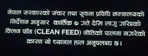 तर एक वर्ष समय पाएका केबल वितरकहरूको फितलो तयारी र सरकारी निकायको कमजोर अनुगमनका कारण सबै च्यानलको अग्रिम शुल्क तिरेका ग्राहकहरूले अहिले विदेशी च्यानल हेर्न नपाएको अवस्था छ । दिइएका केही विदेशी च्यानलहरूले अझै विज्ञापन देखाइरहेका छन् भने दुई तिहाईभन्दा बढी विदेशी च्यानल कटौती गरिएका छन् । जसमा एउटा सूचना नेपाली र अङ्ग्रेजीमा घुमाइएको छ – ‘‘नेपाल सरकारको संचार तथा सूचना प्रविधि मन्त्रालयको निर्देशन अनुसार, कार्तिक ७ गतेदेखि लागू गरिएको क्लिन क्लिनफिड (CLEAN FEED) नीतिको पालना नगरेको कारण यो च्यानल हाल अनुपलब्ध छ ।’’
