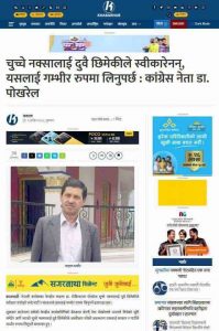 त्यस दिन म घरमै बसेर लेखाइ पढाइ गर्दै थिएँ । दिउँसो पत्रकार भुपराज खड्काले फोन गरेर ठट्टा गर्दै “कहिले देखि नेपाली काङ्ग्रेसमा प्रवेश गरेर केन्द्रीय सदस्य बनेको हौ सर” भन्नू भयो । मैले कुरा नबुझे पछि “डाक्टरको अन्तर्वार्तामा तपाईंको फोटो हालेर एउटा अनलाइनले छापेछ मैले लिङ्क पठाई दिएको छु” भन्नू भयो । म लिङ्क हेर्न थाले । यता पत्रकार मित्रहरूको फोन आउने क्रम सुचारु भयो । दिनभर म फोन उठाउनमै व्यस्त भए । साँझको ७ बजेपछि होला डाक्टर पोखरेलले फोन गरेर “बधाई है दाइ फोटो छापिएकोमा” भन्नू भयो । मैले पनि “तपाईंलाई पनि बधाई है डाक्टर साब राम्रो अन्तर्वार्ता दिनु भएकोमा” भने । हामी दुवै एक्छिन हास्यौ ।