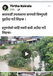 वरिष्ठ पत्रकार तीर्थ कोइरालाले सामाजिक सञ्जालमा हनुमन्ते खोला सहर पसेको भिडियो सामग्री सहित एउटा टिप्पणी पोष्ट गर्नुभयो–– ‘‘काठमाडौँ उपत्यकामा बागमती बिष्णुमती नुहाउँदा नाम लिइन्छ । हनुमन्तेको चाहिँ यसरी बाढी आउँदा नाम लिइन्छ ।’’ उहाँको पोष्टमा विभिन्न प्रतिक्रिया आए । त्यसमध्ये एउटा प्रतिक्रिया आयो पूर्व मन्त्री लक्ष्मण घिमिरेको, ‘‘तथ्य चाहिँ…खोलाहरूमा बस्ती पसिरहेछ ।’’ विकास ढकालको प्रतिक्रिया आयो, ‘‘बगर नमिचिएका ठूला खोलाले बरु कम क्षति पु¥याएका छन् । चन्द्रमणि गौतमको प्रतिक्रिया, ‘‘बस्तीमा खोला पस्नु र खोलामा बस्ती पस्नु बराबरी भइरहेको छ ।’’ पिताम्बर अधिकारीको प्रतिक्रिया, ‘‘लु जा हनुमानले पनि जिउ तन्काएछन् । कति कुक्रुक्क परून् !!!’’ यीभन्दा निकै कडा प्रतिक्रिया आयो प्रा.डा. राजकुमार पोखरेलको, ‘‘अलिक पुगेन नदी मिच्न त्यसैले पानी पर्न पुगेको छैन है । हे झरी निरन्तर एक हप्ता पर त ।’’