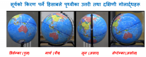 नेपाल लगायत मुख्य एसियाली भूभाग, उत्तरी र मध्य अमेरिका, मध्य र उत्तरी अफ्रिका तथा युरोप उत्तरी गोलार्द्धमा रहेका छन् । जमिनको हिसाबले पृथ्वीको ठूलो भूभाग उत्तरी गोलार्द्धमा पर्दछ । उत्तरी तथा दक्षिणी भूभागलाई छुट्याउन हरेक गोलार्द्धमा एक सय असी वटा काल्पनिक रेखा कोरिएका छन् र हरेकलाई एक डिग्रीका दरले मापन गरिन्छ । जस्तै नेपाल २६ डिग्री २२ मिनेटदेखि ३० डिग्री २७ मिनेट उत्तरी अक्षांसमा पर्छ । अस्ट्रेलियाले १० डिग्रीदेखि ४४ डिग्री दक्षिणी अक्षांस ओगटेको छ । जसरी दिन र रातका हिसाबले पूर्वी र पश्चिमी गोलार्द्धमा विपरीत स्थिति हुन जान्छ, त्यस्तैगरी ऋतुजन्य यामहरूमा उत्तरी र दक्षिणी गोलार्द्धबीच विपरीत स्थिति हुन पुग्छ । उत्तरमा गर्मी भए दक्षिणमा जाडो, दक्षिणमा गर्मी भए उत्तरमा जाडो । अहिले हामी नेपाल लगायत उत्तरी गोलार्द्धका वासिन्दाहरू जाडोको मौसम वा हिउँदमा छौँ भने यति नै खेर अस्ट्रेलिया लगायतका दक्षिणी गोलार्द्धका वासिन्दाहरू गर्मी या बर्खायाममा छन् ।